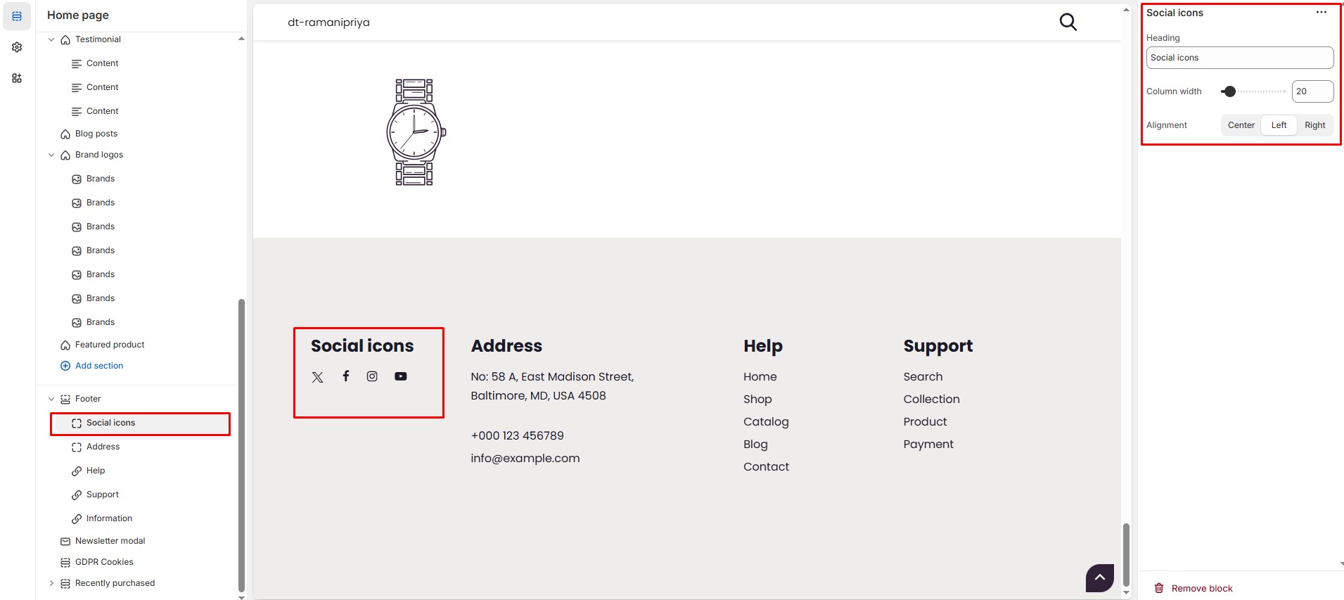 The Social Icons Block in the Footer Section allows you to display links to your social media profiles, helping visitors easily connect with your brand on various platforms.
