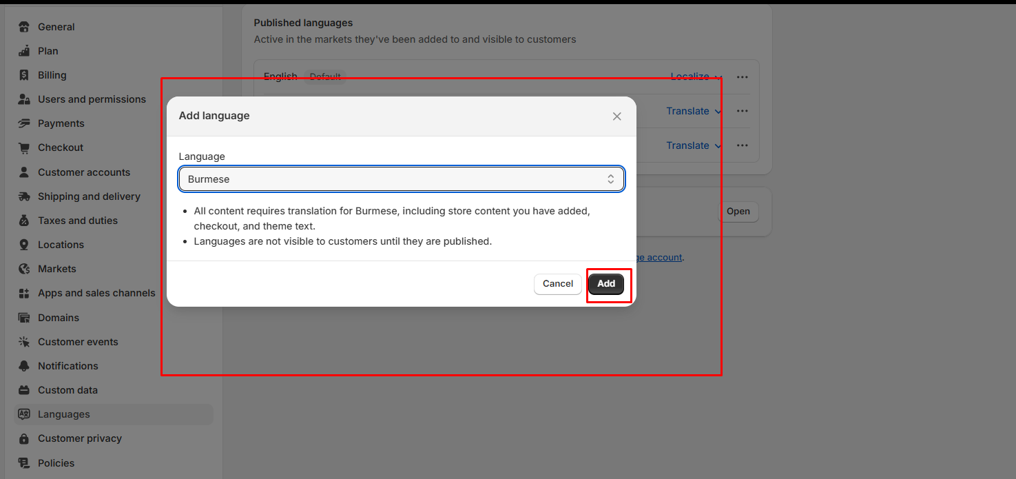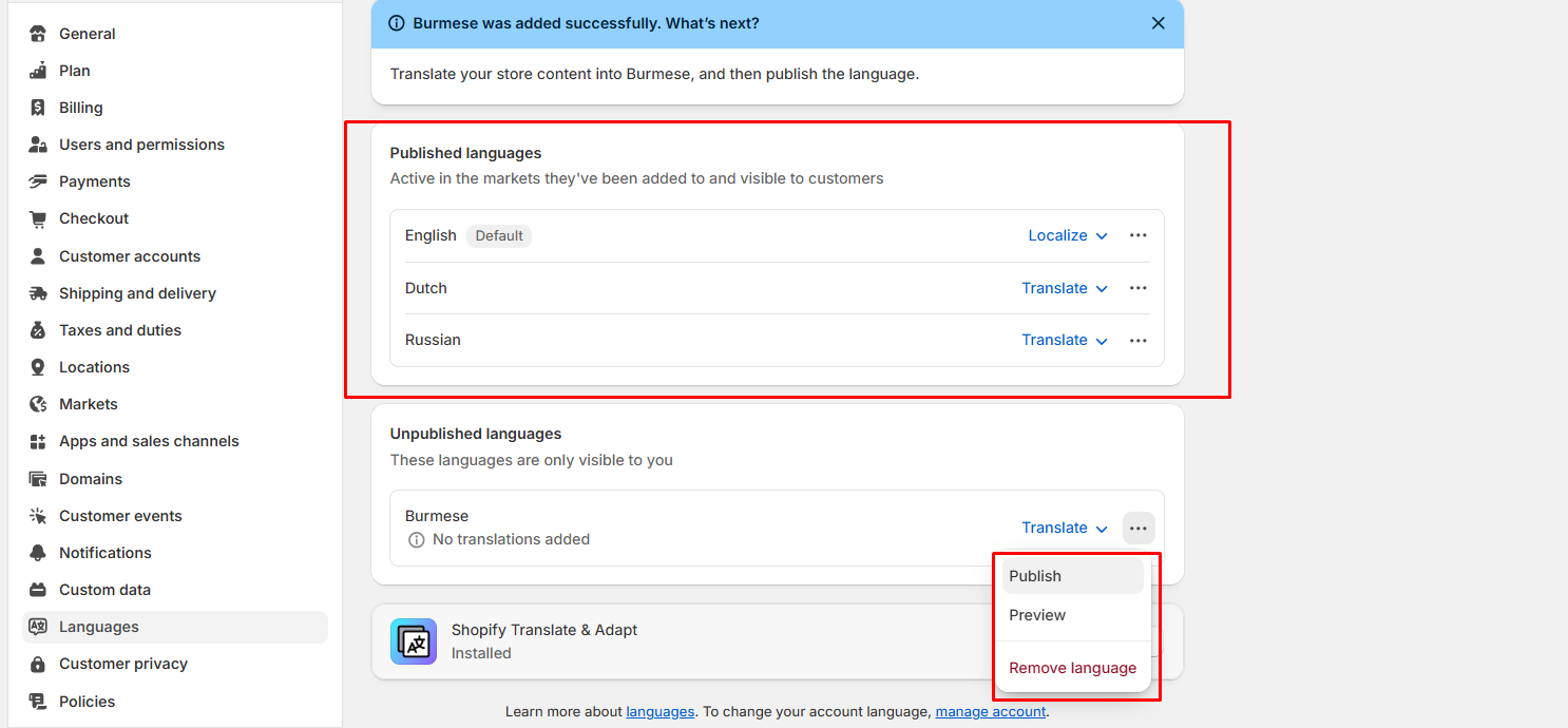 Open Admin Store Settings > Languages > Install translate & adapt app ( Shopify Translate & Adapt).