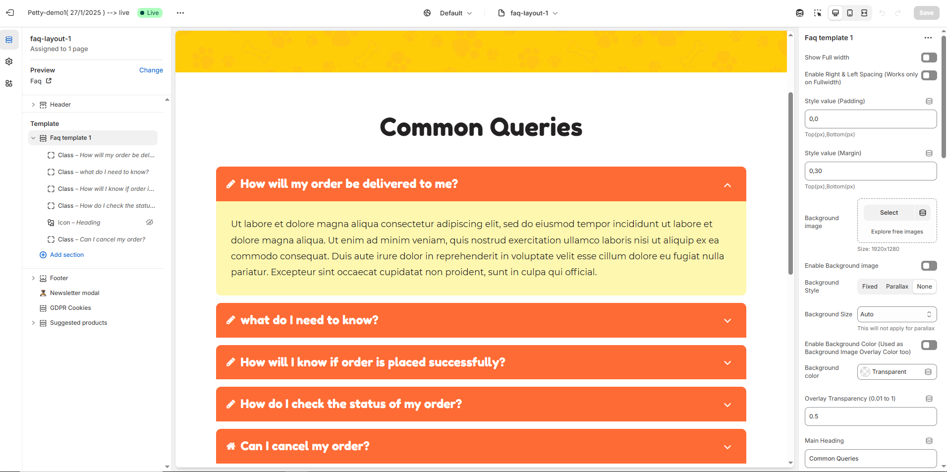 Step 2 : On the left sidebar, you can add sections for the faq.