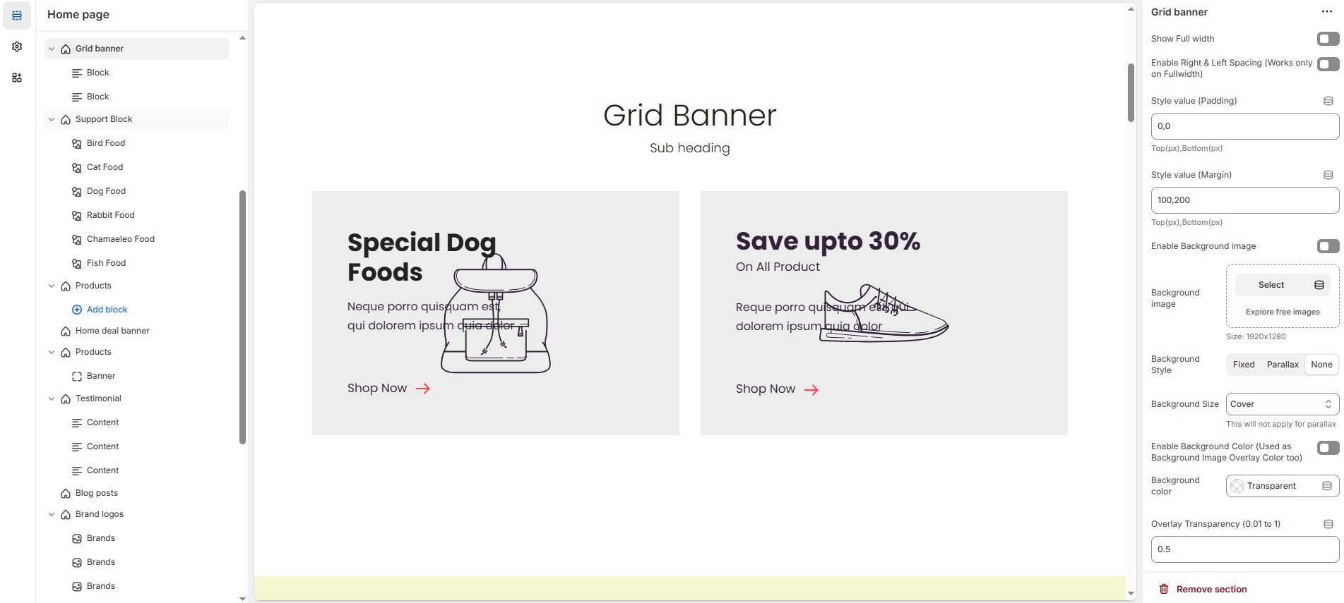 The Grid Banner Section allows you to display multiple banners in a structured grid layout, making it ideal for showcasing promotions, featured categories, or brand messages.