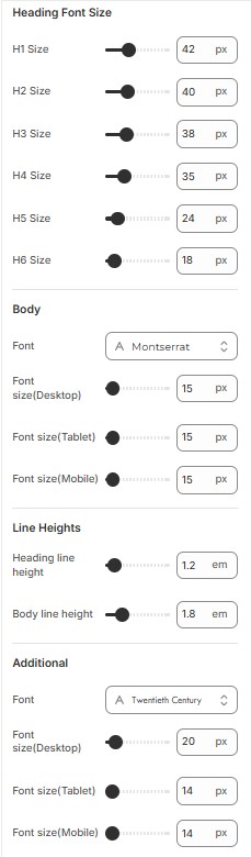 Additional Font size: Adjustment of additional fontsize of Desktop , Tablet and Mobile can be done as per theme requirements.