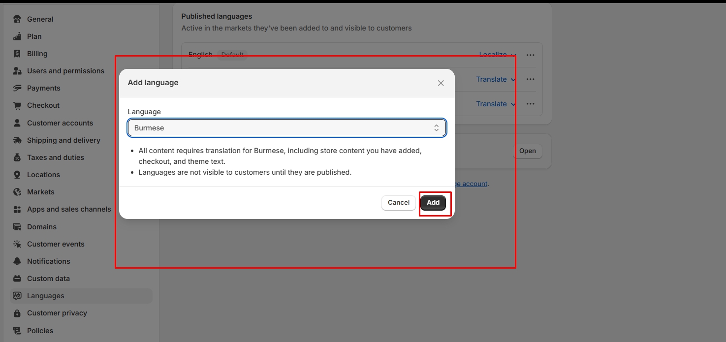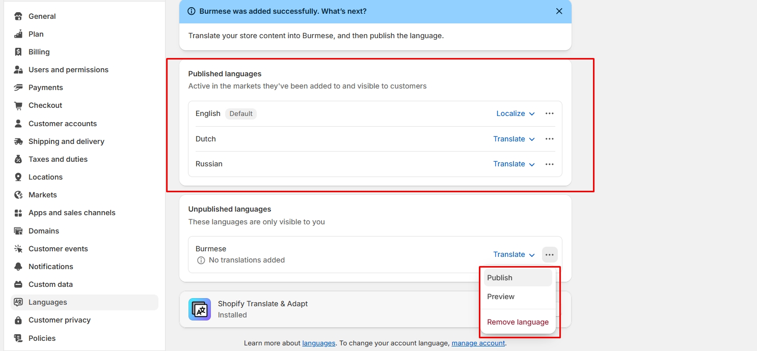 • Open Admin Store Settings > Languages > Install translate & adapt app ( Shopify Translate & Adapt).